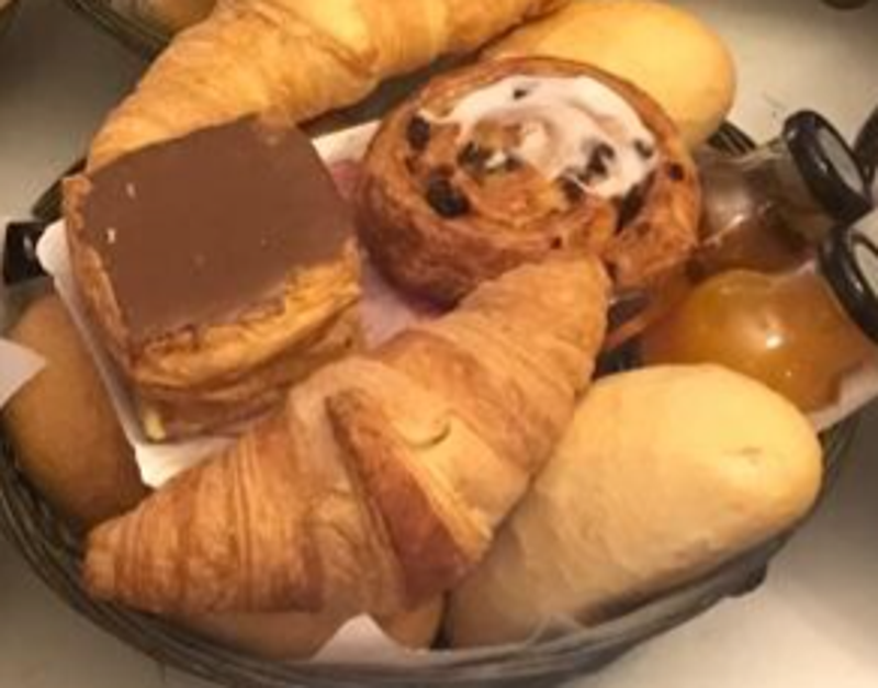 4 pistolets, 2 broodjes, 2 croissants en 2 koffiekoeken, confituur, boter, ham en kaas, extra beleg, fruitsap